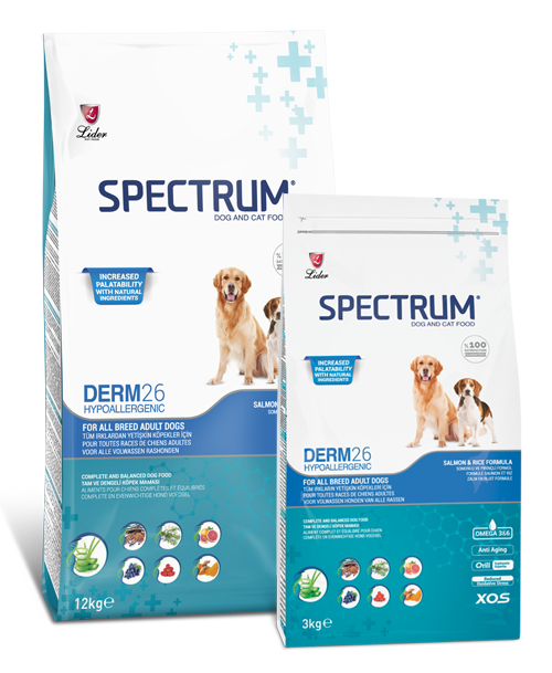 SPECTRUM Derm26, hassas tüy örtüsü ve deri dokusuna sahip erişkin köpeklerin (10 aylıktan 8 yaşına kadar) beslenme gereksinimlerini karşılamak üzere özel olarak formüle edilmiş tam ve dengeli ultra premium köpek mamasıdır.